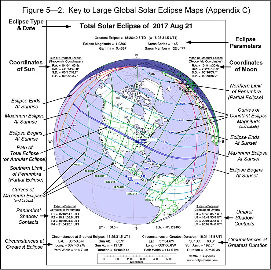 Below is the key to the large global eclipse maps in Appendix C. It identifies the various curves and features in each map.
