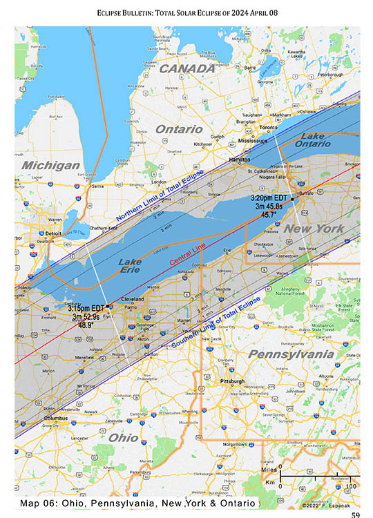 Eleven high resolution maps plot the total eclipse track across Mexico, the USA, and Canada. The large map scale (1 inch ≈ 53 miles) shows hundreds of cities and towns in the path, the location of major roads and highways, and the duration of totality with distance from the central line. The map below is an example one of the maps covering Ohio, Pennsylvania, New York, and Ontario.