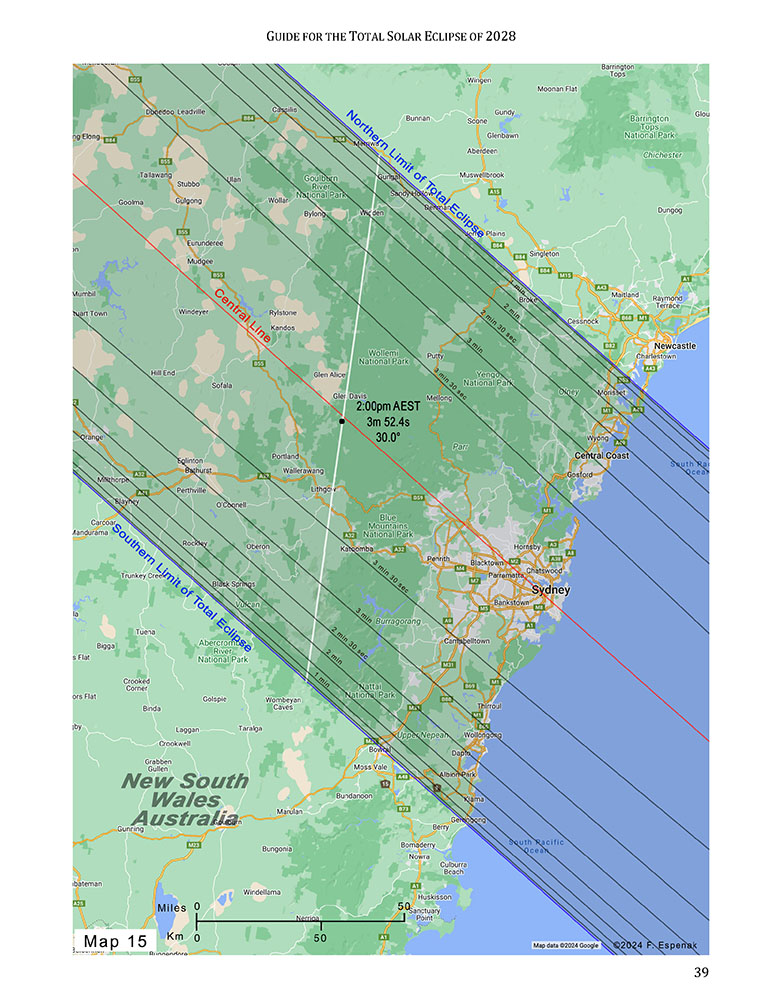 The Guide for the Total Solar Eclipse of 2028 contains a comprehensive series of 19 full-page maps of the path of totality across Australia andNew Zealand. The large scale (1 inch ≈ 22 miles) shows major roads, towns and cities, rivers, lakes, and mountain ranges.