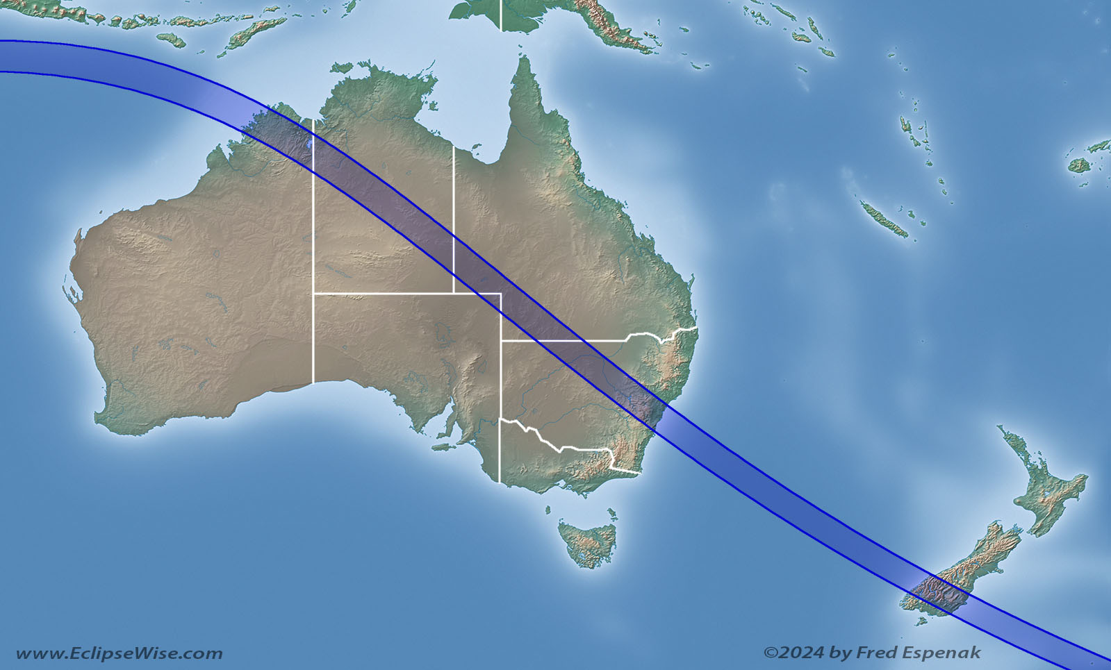 Circumstance tables for over one hundred cities provide times for each phase of the eclipse along with the duration of totality (or eclipse magnitude), and the Sun's altitude. Cloud statistics identify areas where the highest probability of clear sky may be found. Finally, a brief summary is given for total solar eclipses through 2039 with several passing through Australia and New Zealand.