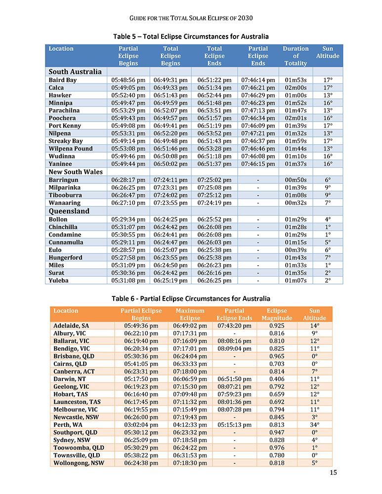 Circumstance tables for over one hundred cities provide times for each phase of the eclipse along with the duration of totality (or eclipse magnitude), and the Sun's altitude. Cloud statistics identify areas where the highest probability of clear sky may be found. Finally, a brief summary is given for total solar eclipses from 2028 to 2039 with several passing through Australia and New Zealand.